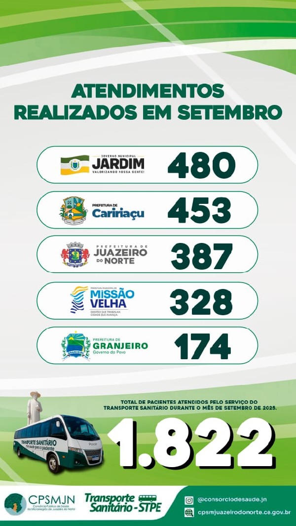 O Consórcio Público de Saúde da Microrregião de Juazeiro do Norte (CPSMJN) apresenta os quantitativos de pessoas transportadas pelo Sistema de Transporte Sanitário no mês de agosto.