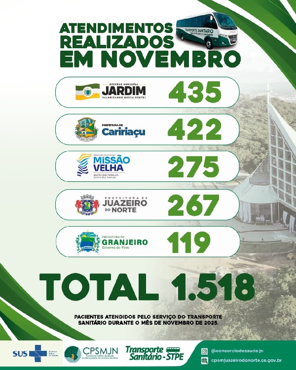 O Consórcio Público de Saúde da Microrregião de Juazeiro do Norte (CPSMJN) apresenta os dados referentes ao Transporte Sanitário do mês de Novembro.