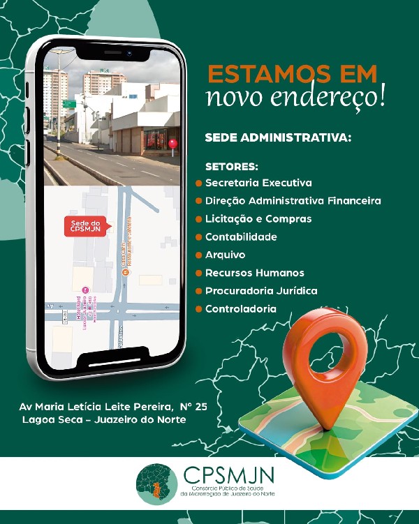 O Consórcio Público de Saúde da Microrregião de Juazeiro do Norte (CPSMJN) está em novo endereço. A nova sede administrativa, localizada na Av. Maria Letícia Leite Pereira, nº 25, bairro Lagoa Seca