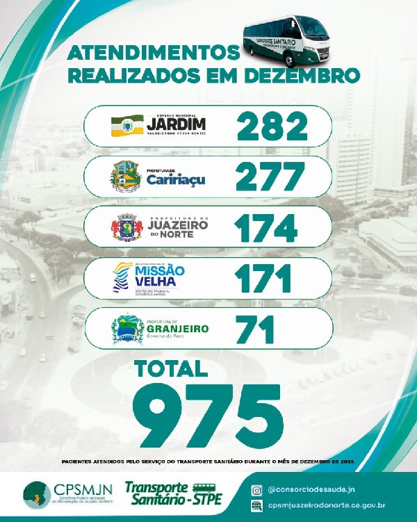 O Consórcio Público de Saúde da Microrregião de Juazeiro do Norte (CPSMJN) apresenta os dados referentes ao Transporte Sanitário do mês de Dezembro.